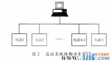 主從總線1∶N通信方式可以采用多種通信協(xié)議實現(xiàn)總線使用權(quán)的分配,本系統(tǒng)中使用的地址查詢方式,主從總線1∶N通信方式的監(jiān)控系統(tǒng)結(jié)構(gòu)示意圖如圖2所示。系統(tǒng)給每個電源分配唯一的一個地址號,計算機(jī)分配一個固定的地址號。當(dāng)計算機(jī)需要和某臺電源建立通信時,計算機(jī)發(fā)出一個含有該電源地址號的請求命令包。掛在總線上的所有電源一直處于等待接收數(shù)據(jù)狀態(tài),計算機(jī)所發(fā)出的請求命令包將被所有的電源所接收。每個電源將接收到的請求命令包中所包含的電源地址號與本模塊的地址號相比較,只有地址號與計算機(jī)所發(fā)出的請求命令包中所包含的地址號相同的電源才與計算機(jī)建立通信,響應(yīng)計算機(jī)所發(fā)出的請求命令。其它地址號不相同的電源將拒絕響應(yīng)計算機(jī)的請求命令,繼續(xù)保持接收數(shù)據(jù)狀態(tài),等待響應(yīng)計算機(jī)發(fā)出的下一個請求命令包。系統(tǒng)中的這種地址查詢方式實現(xiàn)了任何時候總線上最多只有一臺電源與計算機(jī)通信,其它電源處于等待接收數(shù)據(jù)狀態(tài),從而有效地避免了總線使用權(quán)的沖突。