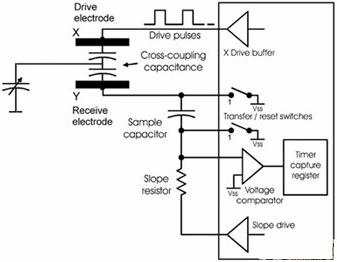 和RC及AC技術(shù)相同,單端電荷轉(zhuǎn)移電容傳感器也是在每個感測通道采用一個電極板,但不依賴于時序測量或放大器,而是采用互補式金屬氧化物半導(dǎo)體(CMOS)開關(guān)把電荷泵入Cx,并把電荷轉(zhuǎn)移到一個參考采樣電容(Cs)中。透過計算Cs達到預(yù)先設(shè)定的電壓值所需的周期數(shù),就可很容易求得電荷電平,且這個周期數(shù)與Cx成反比。眾所周知,電荷轉(zhuǎn)移方法有助于抑制泄漏電流的影響,而且由于其采用一個很大的Cs作為檢測器,這個檢測器相當(dāng)于對外界的一個低阻抗,故其抗外部電氣噪聲的能力非常強。