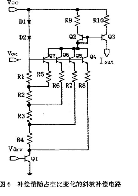 因?yàn)?Q4 ,Q5,Q 6和Q7是先后開啟的,所以補(bǔ)償電流在時間軸上的斜率dlout/dt將隨著Vosc的增大而增大,即斜坡補(bǔ)償?shù)牧侩S占空比增大而增大。