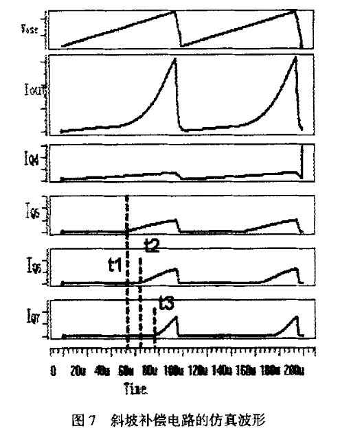 圖7是在選取了元件尺寸后計算機(jī)仿真波形。其中Vosc是理想化的鋸齒波,Iout是輸出的補(bǔ)償電流,IQ4、IQ5、IQ6、 IQ7分別是Q4, Q5, Q6和Q7的漏極電流,可以看到,為了在占空比小于50%的時候系統(tǒng)更加穩(wěn)定,Q4在每個周期開始時就已經(jīng)開啟,但是電流的斜率較小。隨著Vosc以恒定的斜率上升,將先后在t1, t2, t3時達(dá)到Q5, Q6和07的開啟點(diǎn)。設(shè)Q4, Q5, Q6, Q7開啟后的電流斜率分別為m4, m5, m6和m7,