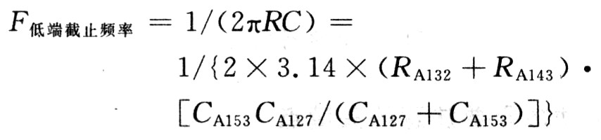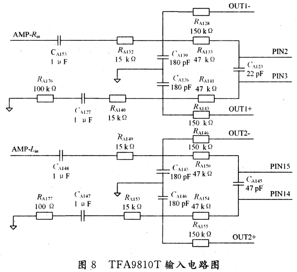 TFA9810T輸入端采用可抑制共模干擾的全差分輸入電路。以圖8 AMP-Rin輸入端為例,RA128/RA133/CA139構成負反饋低通濾波器,用于衰減反饋信號中高頻載波成分。增加低頻成分反饋量,特別是直流成分。有效改善了零輸入時因輸入信號直流電平與比較器門限電壓差異形成的占空比誤差,調(diào)整RA128也可實現(xiàn)TFA9810T增益控制,使Au(dB)=20log(VOUT/VIN)≌20log(RA128/RA132)。器件CA153/RA132/RA133及TFA9810T內(nèi)阻構成高通濾波器,用于對輸入信號的緩沖。若CA153容值過小,會影響低頻響應,理論確定公式為: