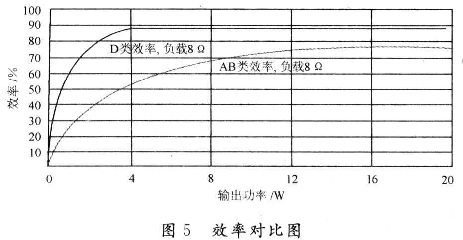 由上述公式得知,D類功放中負載RL,相對其他電阻,比值越大效率越高;MOSFET作為續(xù)流開關,所消耗的功率幾乎等于MOSFET導通阻抗上I2RON損耗和靜態(tài)電流總和,相比較輸出到負載的功率幾乎可忽略。所以,其效率遠高于線性功放,如圖5所示。非常適應現(xiàn)今綠色節(jié)能的要求,適合被平板等數(shù)字視聽產(chǎn)品規(guī)模使用。