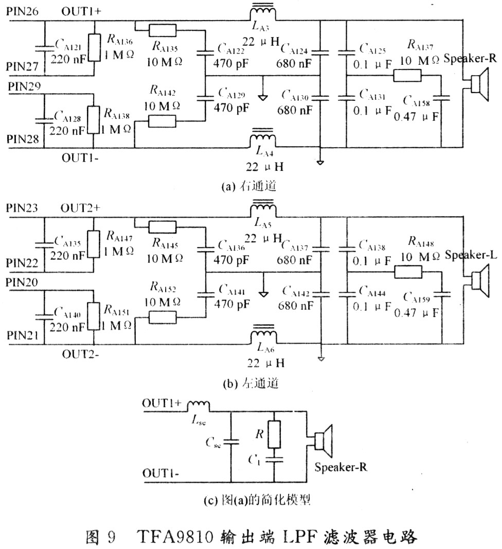TFA9810T輸出端低通濾波器采用二階巴特沃思濾波器方式,實際的巴特沃思二階濾波器由圖9中RCA類電子元器件CA135/RA145/CA136/LA5/CA137/CA138/RA148/CA159/CA140/CA141/RA152/LA6/CA142/CA144等構成,對PWM方波中15 Hz~20 kHz音頻成分表現(xiàn)為直通效應,對超過音頻范圍的20 kHz以上高頻成分呈現(xiàn)-12 dB/倍頻程滾降率。