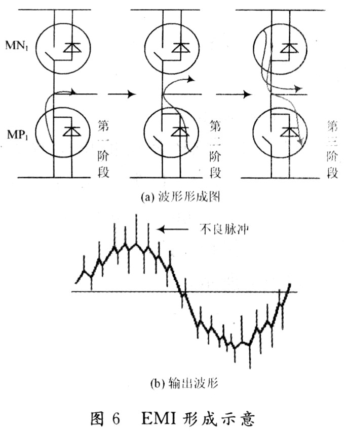 (1)輸出信號中將產(chǎn)生毛刺,造成電磁干擾,也即死區(qū)時間內(nèi),IN1/IN3都關斷。完全失控的輸出電壓將受到圖6(a)中體二極管電流的影響(體二極管電流的形成,參見下文EMI節(jié)),輸出波形中將出現(xiàn)毛刺干擾。