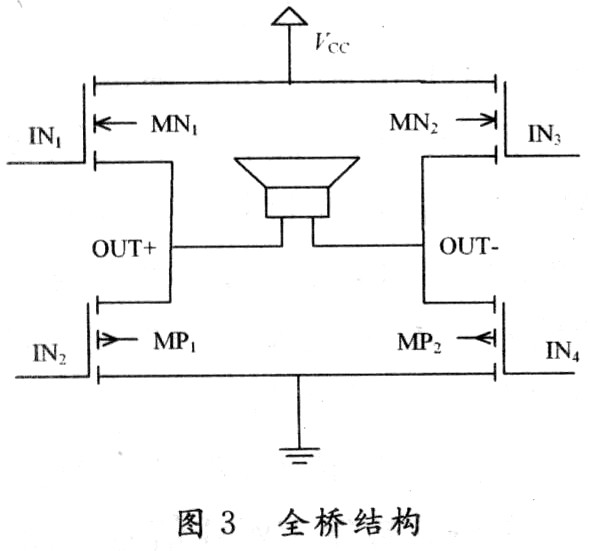 全橋MOSFET管輪流成對導通,理想狀態(tài)一對導通,另一對截止,但實際上功率管的開啟關斷有一個過程。過渡過程中,必有一瞬間,如圖3所示,在IN1/IN3尚未徹底關斷時IN2/IN4就已開始導通;因MOSFET全部跨接于電源兩端,故極端的時間內(nèi),可能會有很大的電壓電流同時加在4個MOSFET上,導致功耗很大,整體效率下降,而且器件溫升加劇,燒壞MOSFET,降低可靠性。為避免兩對MOSFET同處導通狀態(tài),引起有潛在威脅的很大短路電流,應保證一對MOSFET導通和另一對MOSFET截止期間有一個很短的停滯死區(qū)時間(Dead-time),這個時間由Logic邏輯控制器控制,以有效保證一組MOSFET關斷后,另一組MOSFET再適時開啟,減小MOSFET損耗,提高放大器效率。
