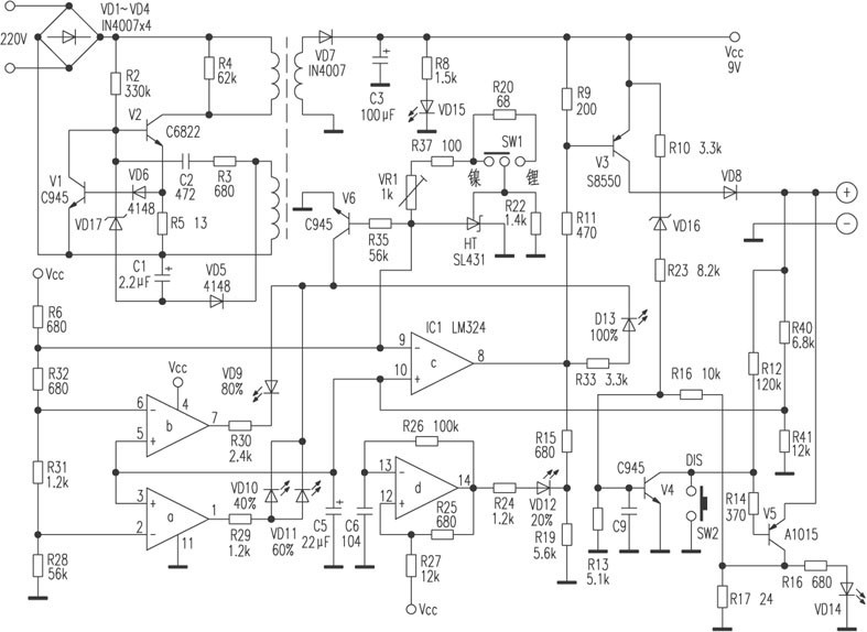 如果是為鎳鎘、鎳氫電池充電,由于這類電池存在一定的記憶效應(yīng),需不定時(shí)對(duì)其進(jìn)行放電。SW1是鎳鎘、鎳氫、鋰離子電池充電轉(zhuǎn)換開關(guān)。SW1與精密基準(zhǔn)電源SL431為運(yùn)放LM324 ⑨提供兩個(gè)不同的精密基準(zhǔn)源,由SW1切換。在給鎳鎘、鎳氫電池充電時(shí),LM324 ⑨腳的基準(zhǔn)電壓約0.09V(空載);在給鋰離子電池充電時(shí),LM324 ⑨腳的基準(zhǔn)電壓約為0.08V(空載),這種設(shè)計(jì)是由這兩種類型電池特有的化學(xué)特性決定的。按下SW2,V5基極瞬間得一低電平而導(dǎo)通,可充電池上的殘余電壓通過V5的e c極在R17上放電,同時(shí)放電指示燈VD14點(diǎn)亮。在按下SW2后會(huì)隨即釋放,這時(shí)可充電池上的殘余電壓通過R16、R13分壓,C9濾波后為V4的基極提供一個(gè)高電平,V4導(dǎo)通,這相當(dāng)于短接SW2。隨著放電時(shí)間的延長,可充電池上的殘余電壓也越來越低,當(dāng)V4基極上的電壓不能維持其繼續(xù)導(dǎo)通時(shí),V4截止,放電終止,充電器隨即轉(zhuǎn)入充電狀態(tài)。