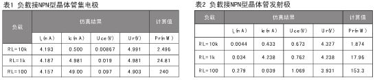 為了說明晶體管負載的不同接法對驅動電路的影響,我們借助Multisim 10 仿真軟件分析負載電阻為100、1k、10k 情況下圖3(a)、(b)中電路的各個參數(shù),得到的仿真結果如表1 和表2 所示。