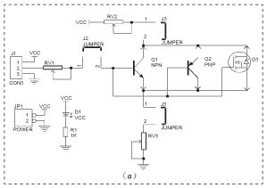 我們制作了晶體管的測試電路板,分別對NPN 型晶體管2N5551、PNP 型晶體管2N5401 驅動電路中相同負載的不同接法做了實物測試。圖4(a)是晶體管測試電路板的原理圖,將圖4(a)左邊J1 的1、2 引腳短接,可以測試NPN 型晶體管負載驅動電路;將J1的2、3引腳短接,可以測試PNP型晶體管負載驅動電路。