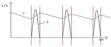 一般開關(guān)電源為容式濾波,在輸入與整流濾波部分電磁噪聲主要是由整流過程中造成的電流尖峰、電壓波動所引起的。正弦波電源經(jīng)過電源濾波器進(jìn)行差模、共模信號衰減后,由整流橋整流、電解電容濾波,得到的電壓作為高頻逆變部分的輸入電壓。由于濾波電容的存在,使整流器不象純整流那樣一組開通半個周期,而是只在正弦電壓高于電容電壓時才導(dǎo)通,造成電流波形非常陡峭,同時電壓波形變得平緩。電流、電壓的波形如圖2所示。