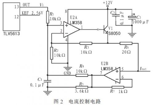 電流控制模塊:為了獲得較高的控制精度,選用12位精度的DAC(Digital-to-AnedIogueConverters,數(shù)模轉(zhuǎn)換器)TLV5613加上V/I轉(zhuǎn)換電路輸出穩(wěn)定電流值加載到測量回路,用于控制二極管的工作電流。