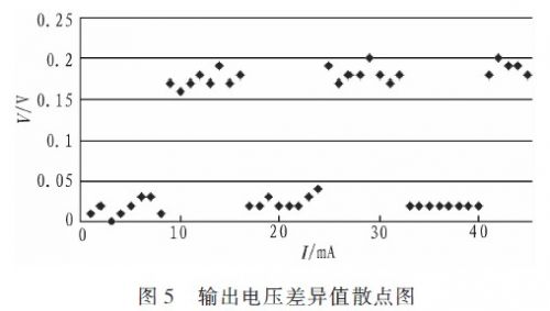 在軟硬件設(shè)計(jì)全部完成后的測試階段,發(fā)現(xiàn)DA輸出的電壓值在某些點(diǎn)上與理論值不符,具有較大差異并呈現(xiàn)一定的周期性(且都是輸出值比理論值小)。通過初步分析,認(rèn)為是DA的控制字寫入在某些點(diǎn)上不正確,于是將硬件電路上AD的模擬電壓輸入引腳斷開并直接接在DA電壓輸出腳,并編寫了測試小程序,將0~5V每次遞增0.02V對應(yīng)的控制字寫入DA,用AD測其輸出電壓值并將結(jié)果通過串口返回PC,然后將電壓理論值與實(shí)測值的差值全部導(dǎo)入Excel,然后在Excel中插入這些值的散點(diǎn)圖,散點(diǎn)圖如圖5所示,0~250mA電流值分別對應(yīng)0~5V的電壓值(圖中截取了0~45mA這一段),縱坐標(biāo)為輸出電壓理論值與實(shí)際值的差異值。