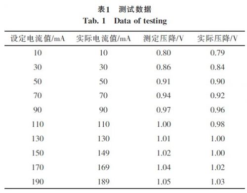 被測二極管采用1N4118,用2個優(yōu)利德數(shù)字萬用表UT33D作為測量儀器對系統(tǒng)進(jìn)行測試,其中一個以毫安檔(量程200mA)與被測二極管串聯(lián),另一個以直流電壓檔(量程5V)與被測二極管并聯(lián),在不同的設(shè)定電流值下測量二極管的實(shí)際電流和電壓,測試結(jié)果如表1。