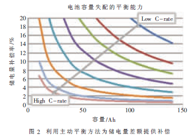 主動平衡系統(tǒng)的性能取決于平衡電流與電池充電和放電率之間的比率。電池的不平衡率越高而且充電或放電率越大,所需的平衡電流便越高。主動式電池管理系統(tǒng)可以在充電或放電時為小電池之間的儲電量差額提供補償(假設采用的平衡電流恒定不變),圖2顯示這個差額的補償數(shù)值。