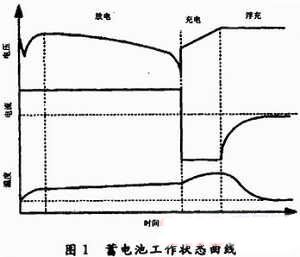 蓄電池在工作工程中主要具有3種工作狀態(tài):放電狀態(tài)、充電狀態(tài)和浮充狀態(tài)。處于放電狀態(tài)時(shí),蓄電池將儲蓄的化學(xué)能轉(zhuǎn)化為電能供給負(fù)載;充電狀態(tài)是在蓄電池放電之后進(jìn)行能量儲蓄的狀態(tài),此種狀態(tài)下電能轉(zhuǎn)化為化學(xué)能存儲起來;浮充狀態(tài)則是蓄電池維持一定化學(xué)能存儲量所要保持的工作狀態(tài),浮充狀態(tài)下的蓄電池的儲能不會因?yàn)樽苑烹姸鴵p失。放電、充電、浮充電3個狀態(tài)構(gòu)成蓄電池的一個完整的工作循環(huán)。傳統(tǒng)的充電器采用串聯(lián)充電方式,通過各個電池的電流都是一樣的。盡管采用了三段式的充電方法,但是充電時(shí)能控制的電壓只是電池組的串聯(lián)電壓,仍然伴有電池組充電不均衡并且擴(kuò)大的現(xiàn)象。蓄電池工作狀態(tài)曲線如圖1所示。因此在此基礎(chǔ)上采用一種新的解決方法。