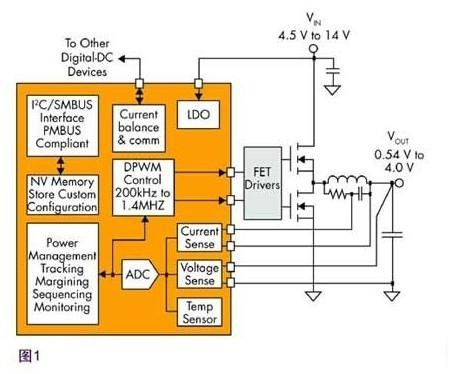 一個應(yīng)用建議是把DC-DC轉(zhuǎn)換器盡可能靠近負載放置。這樣做可以把EMI降至最低、減小寬的大電流線跡所占用的板空間,并改進轉(zhuǎn)換器的動態(tài)特性。“分布式”功率管理系統(tǒng)應(yīng)運而生,在這種系統(tǒng)中,所有轉(zhuǎn)換器都理想地彼此相連。能夠與其它轉(zhuǎn)換器在網(wǎng)絡(luò)中協(xié)同工作的一個控制器例子是FD2004,如圖1的模塊示意圖所示。