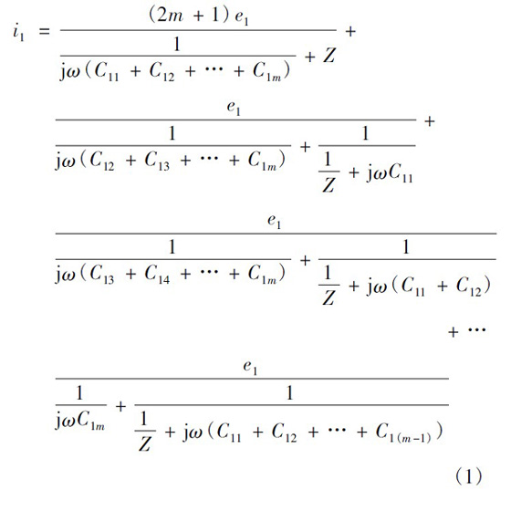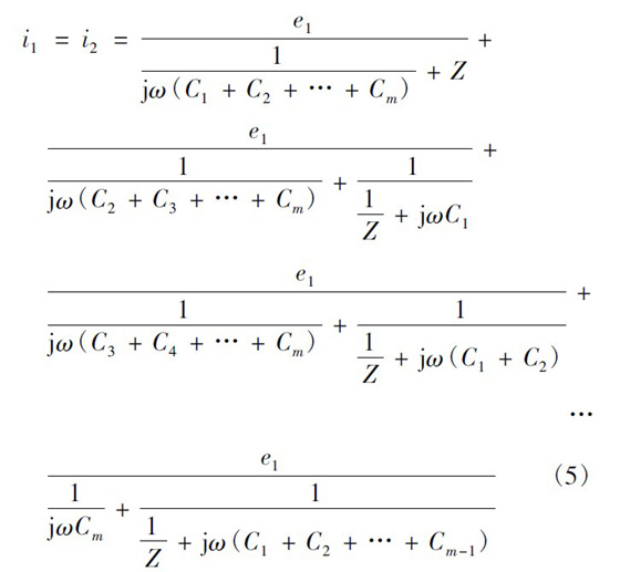 設(shè)一次繞組有3 層,每層m 匝,二次繞組僅一層,為n 匝。當(dāng)變壓器磁芯中的磁通發(fā)生變化,便會(huì)同時(shí)在一次側(cè)和次級(jí)產(chǎn)生感應(yīng)電動(dòng)勢(shì)。根據(jù)疊加定理,可認(rèn)為這是僅一次繞組有感應(yīng)電動(dòng)勢(shì)、二次繞組電動(dòng)勢(shì)為零和僅二次繞組有感應(yīng)電動(dòng)勢(shì)、一次繞組電動(dòng)勢(shì)為零兩種情況的疊加。僅一次繞組有感應(yīng)電動(dòng)勢(shì)、二次繞組電動(dòng)勢(shì)為零的情況如圖5 所示。圖5 中:e1為每匝一次繞組的感應(yīng)電動(dòng)勢(shì);C1x為一匝最外層一次繞組與二次繞組間的寄生電容。