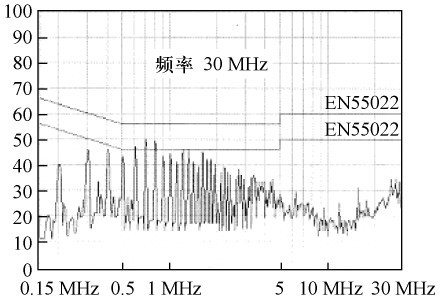 由式(4) 可知:在電路工作情況不變的狀況下,共模電流i1的第一項(xiàng)減小為原來的1 /(2m +1),故傳導(dǎo)EMI 減小了,測(cè)試結(jié)果如圖9 所示。