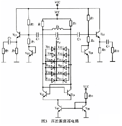 壓控振蕩器按構成原理可分為反饋型振蕩器和負阻型振蕩器2大類。這里采用負阻型振蕩器,其主要是由負阻器件和諧振回路組成的振蕩器,利用負阻器件的負電阻效應與諧振回路中的損耗正電阻相抵消,維持諧振回路的穩(wěn)定振蕩。圖3為壓控振蕩器電路。