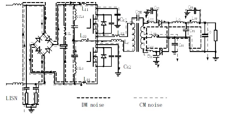 通常電路中的共模干擾和差模干擾是同時(shí)存在的,共模干擾存在于電源的任意一個(gè)相線與大地之間,差模干擾存在于相線與相線之間。法國(guó)Grenoble 電技術(shù)實(shí)驗(yàn)室的Teuling、Schnaen 和Roudet 基于由MOSFET 構(gòu)成的400W、開(kāi)關(guān)頻率為100KHz 的斬波電路實(shí)驗(yàn)?zāi)P偷难芯勘砻?,低頻時(shí)差模干擾占主導(dǎo)地位;高頻時(shí),共模干擾占主導(dǎo)地位,這說(shuō)明開(kāi)關(guān)電源的差模干擾和共模干擾對(duì)電路的影響程度是不同的;另一方面,線路寄生參數(shù)對(duì)差模干擾和共模干擾的影響也不同,由于線間阻抗與線———地阻抗不同,干擾經(jīng)長(zhǎng)距離傳輸后,差模分量的衰減要比共模大。因此,為了解決開(kāi)關(guān)電源的傳導(dǎo)噪聲問(wèn)題,需要首先區(qū)分共模和差模干擾,這就需要建立共模和差模噪聲路徑,然后對(duì)它們分別進(jìn)行仿真和分析,這種方法便于我們找到電磁干擾問(wèn)題的根源,便于問(wèn)題的解決。