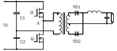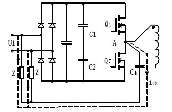 在PWM變換器工作時(shí),伴隨著開(kāi)關(guān)器件的工作,也相應(yīng)產(chǎn)生了共模噪聲。如圖1 所示,對(duì)于半橋變換器,開(kāi)關(guān)管Q1 的漏級(jí)電壓始終為U1,源級(jí)電位隨開(kāi)關(guān)狀態(tài)的改變而在0 和U1/2 之間變化;Q2 的源極電位始終為0,漏極電位在0 和U1/2之間變化。為使開(kāi)關(guān)管和散熱器能保持良好接觸,往往在開(kāi)關(guān)管底部與散熱器之間加上絕緣墊片或者抹上導(dǎo)熱性能良好的絕緣硅膠。這使得A 點(diǎn)對(duì)地之間相當(dāng)于存在一個(gè)并聯(lián)耦合電容CK。當(dāng)開(kāi)關(guān)管Q1、Q2 的狀態(tài)發(fā)生改變,使A 點(diǎn)電位發(fā)生變化時(shí),就會(huì)在CK 上產(chǎn)生噪聲電流Ick,如圖2 所示。該電流由散熱器到達(dá)機(jī)殼,而機(jī)殼也即大地與主電源線存在耦合阻抗,形成圖2中虛線所示的共模噪聲通路。于是,共模噪聲電流在地與主電源線的耦合阻抗Z 上產(chǎn)生壓降,形成共模噪聲。