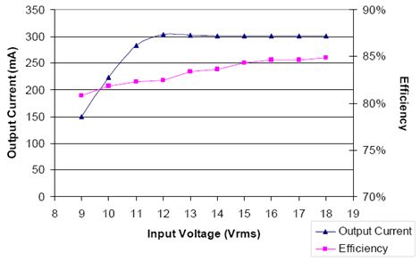 在電路配置方面,VBAT的額定電壓為-0.3至+40 V,因此整流橋上的輸入電壓高達(dá)24 Vac也是安全的。要保持較高輸入電壓水平就需要一個(gè)大容量的C1。大幅波動(dòng)的經(jīng)整流的AC電流將在雙倍AC線路頻率條件下把輸出電流拉至零,因此減少了輸出電流。220 μF的電容對(duì)這個(gè)設(shè)計(jì)已經(jīng)足夠了。對(duì)于12 Vac輸入,C1額定電壓應(yīng)該是25 V。由于需要較低的正向電壓,整流橋選用了MBR0520L表面貼裝肖特基二極管。