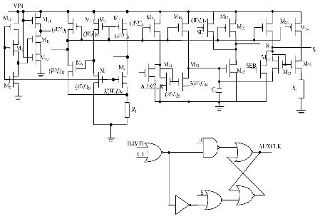 SE 為輔助振蕩器切換信號(hào), SEB 為SE 的反信號(hào)。當(dāng)V DD低于1. 9 V 時(shí), SE 為高電平, M17 , M18 都截止, 不影響R, S 觸發(fā)器的翻轉(zhuǎn), 輔助振蕩器工作, 開關(guān)S1 斷開, S2 閉合; 當(dāng)VDD 高于1. 9 V 時(shí), SE 為低電平, 輔助振蕩器關(guān)斷, 開關(guān)S1 閉合, S2 斷開, M17 , M18 都導(dǎo)通, R=1, S= 0, AU XCLK 被鎖定為高電平, 既減小了功耗, 也避免了輔助振蕩器關(guān)斷之后R, S 端出現(xiàn)不確定狀態(tài)。