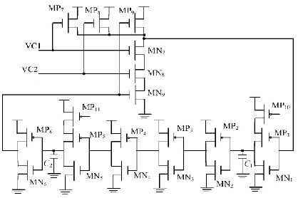本文所設(shè)計(jì)的主振蕩器采用如圖2 所示的環(huán)形振蕩器結(jié)構(gòu)。VC1, VC2 分別為過壓保護(hù)電路, PWM 比較器的輸出信號(hào), MP10和MP11 為帶隙基準(zhǔn)提供的鏡像電流, 合理的控制鏡像電流和電容C1 , C2 的大小, 即能夠使主振蕩器在1. 9~ 8 V 的V DD區(qū)間輸出350 kHz 左右較穩(wěn)定的振蕩頻率。