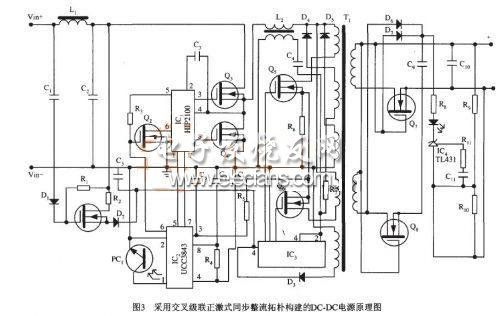 圖 3所 示 為采用交叉級聯(lián)正激變換電路設計的通信設備專用DC-DC半磚電源原理圖。工作原理如下,R,, R2. D,, Q,, D:和C:組成自舉啟動電路,得到啟動電壓Vc分別給ICI,I C2和IC3供電。電路啟動后,T,的輔助繞組經(jīng)D3整流,C3平滑濾波后為IC提供電壓VD,因VD電壓高于Vc,二極管D2反偏,Q、的供電關閉,達到啟動電路無功耗的目的。IC:的腳6輸出方波信號,一路直接送到ICl的腳5,另一路經(jīng)Q2倒相后送到IC:的腳6作為IC,的輸入信號。IC,的腳3和腳8輸出相位相差180“的方波脈沖信號,分別驅動MOSFETQ 31 Q 4- Q3" Q 4" L 2等組成高效率的同步降壓級,降壓級的占空比保持在30-60%. IC3.Qs"Q6"T.等組成交叉級聯(lián)正激式隔離級,達到DC-DC最終的輸出電壓。馬、DS為變壓器T,的磁復位繞組。由于降壓級已將變化范圍較寬的輸入電壓嚴密調(diào)整為中間總線電壓,因此隔離級不需調(diào)壓。交叉級聯(lián)正激變換器都工作在50%的占空比,可以采用VDS為100V的MOSFET. Q7, Q:等組成自偏置式同步整流電路,因隔離級的輸出電壓是固定的,所以同步整流MOSFET漏極的輸入電壓也是固定的,占空比也為50%,可以使用VDS很低的MOSFET(本例中采用的是VDS為12V的MOSFET,損耗最低)因功耗引起的發(fā)熱問題均可以方便解決。因輸入電壓固定,多出電壓時,能夠方便地實現(xiàn)高電壓調(diào)整率和高負載調(diào)整率,單級變換器很難做到此點。其他電路功能(如過流、過壓、過溫度保護等)不再一一闡述。經(jīng)測量該電路的工作效率約在92%左右,達到預定的設計要求,并且調(diào)試較簡單,為今后的批量生產(chǎn)奠定了基礎。