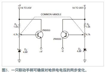 由于晶體管的基-集電極反偏擊穿電壓各不相同,因此電路提供了一種改變電源電壓的簡單方式(圖3)。隨著電壓的升高,與發(fā)射極連接的兩只LED都發(fā)光,而集電極只有一個LED發(fā)光(圖2中b和d)。±4V的基本電壓足夠用于檢測晶體管的基極或類型。如將電源電壓從±4V增至±15V,就可以測試很多種晶體管的發(fā)射極??紤]到串聯(lián)LED的壓降,這個范圍可為基射結(jié)提供最高26V以上的反向擊穿電壓。