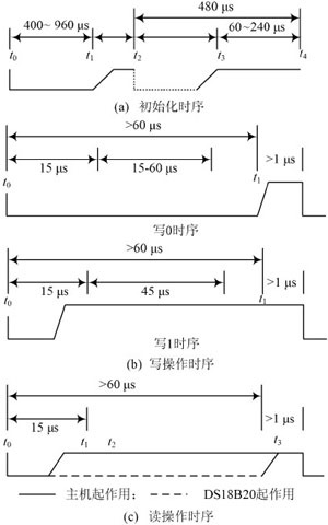 (1)初始化時序。時序見圖2(a),主機總線t0時刻發(fā)送一復(fù)位脈沖(最短為480s的低電平信號)接著在t1時刻釋放總線并進入接收狀態(tài),DS18B20在檢測到總線的上升沿之后等待15~60μs,接著DS18B20在t2時刻發(fā)出存在脈沖(低電平持續(xù)60~240s),如圖中虛線所示。