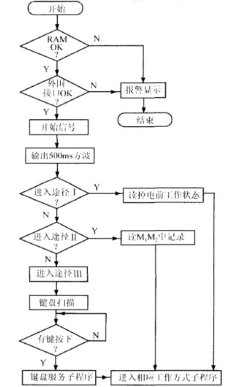 系統(tǒng)進入相應工作方式后,可通過中斷方式接受用戶命令,更換當前工作狀態(tài)(中斷程序框圖省略)。圖5示出系統(tǒng)工作流程圖。