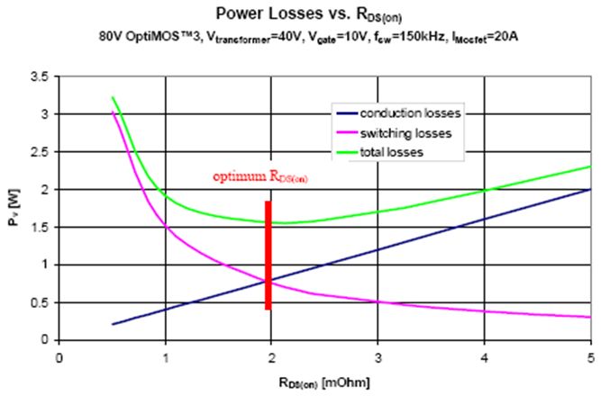 在選擇最適當(dāng)?shù)腗OSFET時(shí),必須特別注意RDS(on) 的取值范圍,如圖3所示。當(dāng)RDS(on)超出最優(yōu)值時(shí),總功耗將隨RDS(on)的提高而線性增加。但當(dāng)RDS(on) 降至低于最優(yōu)值時(shí),總功耗也會(huì)因輸出電容的快速增加而急劇上升。此外,在圖3中可以看出,可實(shí)現(xiàn)最低功耗的RDS(on)值范圍相當(dāng)寬。在本例中,當(dāng)RDS(on)在1毫歐姆至3毫歐姆范圍內(nèi)時(shí),總功耗始終大致相同。但是,在此范圍之外,RDS(on)僅下降0.5毫歐姆,便會(huì)令總功耗提高一倍,從而嚴(yán)重降低電源轉(zhuǎn)換器的效率。