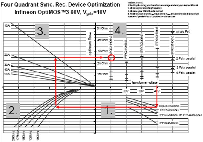 使用優(yōu)化表時(shí),首先從次級(jí)變壓器電壓開(kāi)始。在所用電壓值位置,畫(huà)一條垂直的直線。在兩條線相交處可以選出特定的MOSFET。通過(guò)一條水平的直線和一條垂直的直線,便可選擇開(kāi)關(guān)頻率和MOSFET電流。如前面所討論,按最好從滿負(fù)載的20%至30%的電流值開(kāi)始進(jìn)行選擇。此時(shí),可以在正Y軸上讀取最優(yōu)RDS(on)值。在第四個(gè)象限中,顯示了并聯(lián)MOSFET的最佳數(shù)量。在第四個(gè)象限中,必須選擇之前在第一個(gè)象限中選定的MOSFET型號(hào)。然后,按同樣的參數(shù)(變壓器電壓、開(kāi)關(guān)頻率和電流RMS)對(duì)另一個(gè)型號(hào)的MOSFET重復(fù)執(zhí)行這個(gè)選擇過(guò)程。比較兩次選擇所得到的最優(yōu)RDS(on)值,最優(yōu)RDS(on)值越低的MOSFET所產(chǎn)生的功耗也越低,因而是更加高效的解決方案。