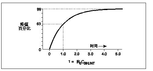 因此,讀數(shù)穩(wěn)定至最終值的1%所需的建立時(shí)間為τ的5倍,也就是50秒。圖7所示為RC電路的階躍電壓指數(shù)響應(yīng)。經(jīng)過一個(gè)時(shí)間常數(shù)(τ = RC)后,電壓上升至最終值的63%。