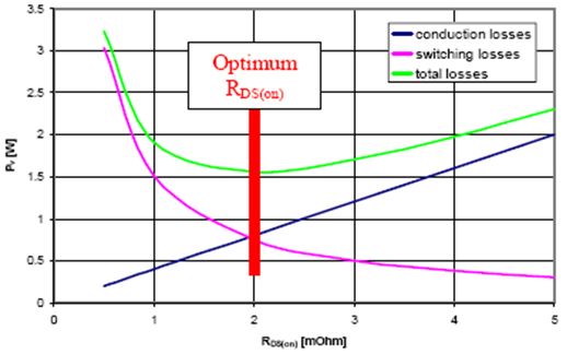 在選擇最適當?shù)腗OSFET時,必須特別注意RDS(on)值的范圍,如圖7所示。當RDS(on)超出最優(yōu)值時(更高RDS(on)),總功耗將線性增加。而當RDS(on) 降至低于最優(yōu)值時,總功耗也會急劇上升。此外,在圖7中可以看出,可實現(xiàn)最低功耗的RDS(on)值范圍相當寬。