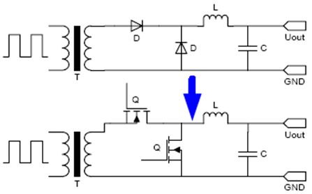 圖1. 同步整流與二極管整流之比較