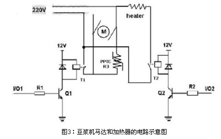 下圖3為多功能豆?jié){機馬達和加熱器的簡單電路示意圖。豆?jié){機所用馬達為220V直流馬達,繼電器的工作電壓為12V,豆?jié){機利用繼電器把MCU發(fā)出的低壓控制信號I/O來控制交流高壓信號的通斷,R3為PPTC可恢復電阻,T1和T2為繼電器。