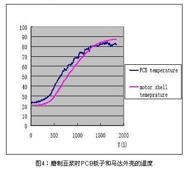 用上文所述的PPTC設計流程可以用在多功能豆?jié){機馬達防堵保護設計中,但這是往往會碰到選擇PPTC型號困難的問題,也就是說多功能豆?jié){機的馬達保護設計會較普通的小家電馬達保護復雜的多,圖4為磨制豆?jié){時PCB板周圍環(huán)境溫度和馬達外殼溫度的實測圖,可見控制電路PCB板PPTC周圍的環(huán)境溫度最高可以到達85C。由于豆?jié){機的PPTC最高環(huán)境溫度85度會比普通的小家電最高環(huán)境溫度要求高,這樣既要在85度的最大工作電流下能正常工作,還要保證在最低溫度0度的堵轉(zhuǎn)電流情況下能及時的保護,相應的就增大了設計難度。下面就具體的闡述此類多功能豆?jié){機馬達堵轉(zhuǎn)的保護設計方案。