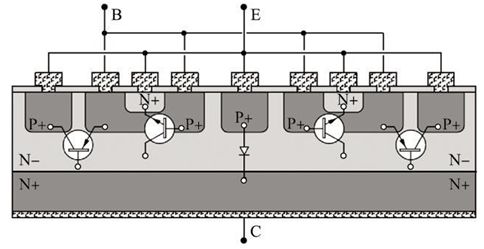 采用鉗位型開關(guān)晶體管也能降低開關(guān)晶體管的關(guān)斷延時(shí), 其原理是通過鉗位電路使VBC在晶體管導(dǎo)通時(shí)不能增加到深飽和所需的0. 7 V, 這樣注入集電結(jié)兩側(cè)的少子很少, 使超量?jī)?chǔ)存電荷很少, 這樣儲(chǔ)存時(shí)間大大縮短。采用鉗位型開關(guān)晶體管主要有兩種, 一種是在集電結(jié)并聯(lián)肖特基二極管的晶體管,由于在高溫下漏電電流較大, 其ts - Vcesat的Trade??o ff關(guān)系最差, 目前應(yīng)用較少。另一種是橫向PNP鉗位型晶體管, 其結(jié)構(gòu)圖如圖6所示, 它在高溫下漏電較小, 能得到較好的Trade-off關(guān)系,電流放大系數(shù)基本不變, 目前得到了越來越多的應(yīng)用, 如吉林華微電子股份有限公司研發(fā)的產(chǎn)品3DD13003A 就采用了這種結(jié)構(gòu)。