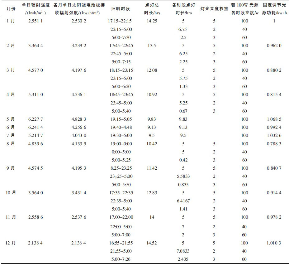 開(kāi)關(guān)燈的時(shí)間根據(jù)天安門(mén)升降旗時(shí)間而定,如表1所示,全年最長(zhǎng)點(diǎn)燈時(shí)長(zhǎng)茌12月為14.52小時(shí),最短為9.13小時(shí)。照明時(shí)間分為3個(gè)時(shí)段,第一個(gè)時(shí)段從當(dāng)天天安門(mén)降旗時(shí)刻開(kāi)始,為5個(gè)小時(shí),第二個(gè)時(shí)段到早上5點(diǎn),第三個(gè)時(shí)段從5點(diǎn)到滅安門(mén)升旗時(shí)刻,燈光亮度各時(shí)段權(quán)重比為5:2:3,如果以100 W光源為設(shè)計(jì)標(biāo)準(zhǔn),則光源功耗最大為1.068 5 kW-h。