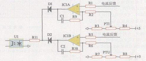對于本應(yīng)用中, 只要比較反饋控制電路里的兩個PI調(diào)節(jié)器( 圖8中IC1A和IC1B) 的輸出端電壓高低, 就能實現(xiàn)狀態(tài)指示。當(dāng)IC1A輸出電壓高于IC1B輸出電壓時, 電流反饋起作用, 電路處于充電狀態(tài)。反之, 處于浮充狀態(tài)。