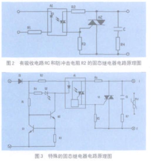 圖1、圖2 和圖3 三種電路都能實現(xiàn)固態(tài)繼電器的功能。圖1 是固態(tài)繼電器最簡單的電路原理圖,圖中A1 是交流光耦,A 2 是雙向可控硅。常用在小型的S S R ,使用時,用戶往往在外面增加器件來改善性能。圖2 是在圖1 的基礎上增加了RC 吸收電路和防沖擊電阻R2 。R 2是保護光耦,抑制在導通瞬間流過光耦的沖擊電流。附加這些器件后,大大改善了SSR 的EMC 特性和浪涌對光耦的沖擊性能。因此該電路常用在可靠性較高的場合。圖3 是一種特殊的電路,常用在高可靠性和E M C 等級較高的SSR 設計中。圖中的二極管D1 可防止輸入反極性。由Q1、Q2、R1 及R3 組成恒流電路,保證當輸入電壓變化時,光耦A 1 的電流恒定。R C 電路C 1 、R 7 和R 6 的功能與圖2 的相同。該電路還增加了壓敏電阻R V 。R V不僅加強了S S R 的過壓保護能力,而且大大改善了其E M C 性能。