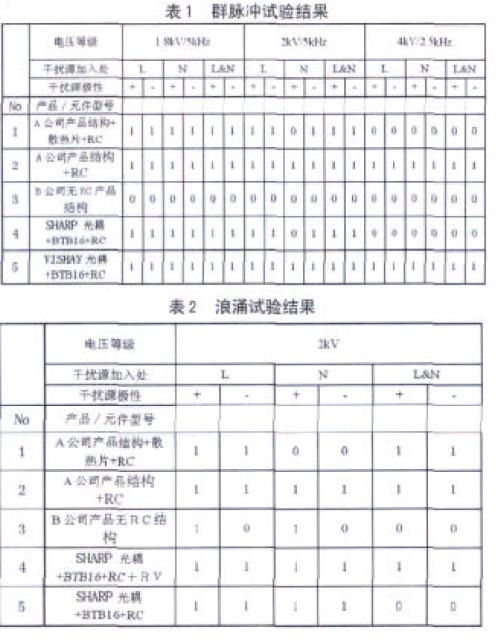 (4) 從試驗數(shù)據(jù)可以看出,在耐電脈沖群沖擊方面,光耦對繼電器的影響較大(見結論的第2 點),不同的光耦其耐沖擊性能不一樣;而在耐Surge 時,可控硅對繼電器的影響最大(較差的可控硅如dv/dt 太低等,將被擊穿);