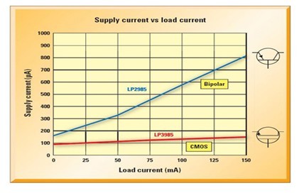 圖 1:不同的低壓降穩(wěn)壓器在滿(mǎn)載電流范圍內(nèi)的供電電流 (Iq) 比較,比較的兩款大致相同的 150mA 低壓降穩(wěn)壓器分別采用 CMOS 及雙極工藝技術(shù)制造
