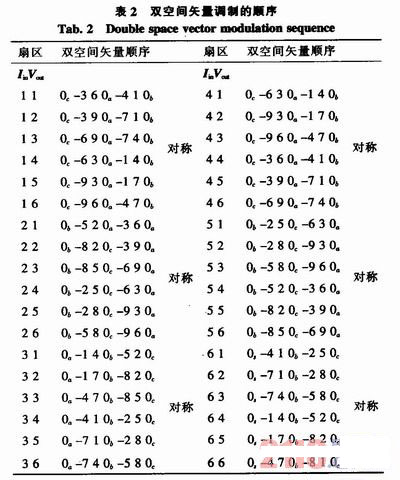 空間矢量調(diào)制法只確定開關間隔中應用電壓矢量的占空比,從而獲得低頻率的輸出電壓和輸入電流的平均值,但是并沒有確定使用的順序。所以需要使用雙空間矢量調(diào)制法,同時也可改善波形的質(zhì)量。圖2表明了輸入電流在4扇區(qū),輸出電壓在5扇區(qū)應用雙空間矢量調(diào)制的順序。電壓矢量在開關間隔中對稱分布,零矢量每4個開關間隔使用一次。在每次開關轉(zhuǎn)換中只有一個開關狀態(tài)發(fā)生改變以最大程度地降低損耗。在圖2中通過表格2確定相應開關時間: