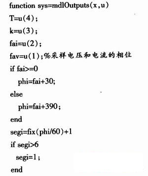 盡管現(xiàn)有的DSP技術(shù)和FPGA技術(shù)處理速度很快,很有效,但矩陣變換器的控制仍非常復雜,在仿真中,若按傳統(tǒng)方法使用定義好的Simulink模塊,會非常繁瑣,因為必須正確的設置大量的參數(shù),而又沒有合適的調(diào)試工具。通過Matlab/Simulink里的功能強大的S函數(shù),S函數(shù)完美地結(jié)合了Simulink框圖簡潔明快的特點和Matlab編程靈活方便的優(yōu)點,可充分利用Matlab提供的豐富資源,調(diào)用各種工具箱函數(shù),實現(xiàn)模塊所無法實現(xiàn)的復雜功能,從而使問題大大簡化。編程中既可以使用C語言,也可以使用Matlab語言來實現(xiàn)空間矢量調(diào)制法。使用后者會更簡單些,以下是部分程序: