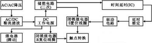 斷電延時(shí)繼電器整體構(gòu)成包括斷電延時(shí)繼電器電源部分(經(jīng)降壓、整流、濾波)以提供斷電延時(shí)繼電器內(nèi)置瞬動(dòng)電磁繼電器和2繞組閉鎖型R復(fù)位線圈工作);二次電源部分(供斷電后延時(shí)部分與2繞組閉鎖型S置位線圈工作);延時(shí)工作部分(可編程定時(shí)集成或CMOS計(jì)數(shù)分頻集成);驅(qū)動(dòng)部分;執(zhí)行繼電器部分組成(圖1)。