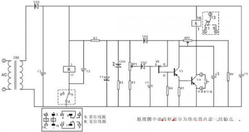 由V2 P溝道場效應(yīng)管、V3、V4三極管以及繼電器為主要器件構(gòu)成的斷電延時(shí)型繼電器示于圖2。如下:端加入工作電源后,C1~C5都按其回路完成充電過程(充電時(shí)間應(yīng)參照產(chǎn)品規(guī)定的時(shí)間)。同時(shí)內(nèi)部2繞組閉鎖繼電器R復(fù)位線圈得電工作(虛框內(nèi)轉(zhuǎn)換觸點(diǎn)4與6由電源接通轉(zhuǎn)為斷開狀態(tài),4與8接通),相應(yīng)外部觸點(diǎn)進(jìn)行轉(zhuǎn)換端接通,呈延時(shí)工作狀態(tài))。