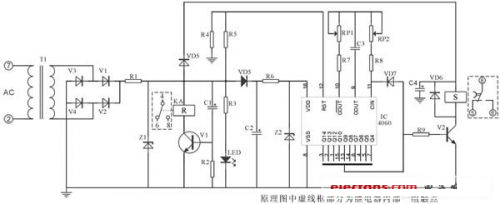 該電路核心部分由IC4541構(gòu)成,延時(shí)設(shè)定由RP2、C*設(shè)定,A-B端根據(jù)需求接相應(yīng)高、低電平(設(shè)定端)內(nèi)部2繞組閉鎖繼電器采用DC12V(因繼電器工作電壓與IC4060組成延時(shí)電器要低,則為保證其驅(qū)動(dòng)則分別由V6、V7、V1、V3構(gòu)成)。其中C2為二次儲能器件,可根據(jù)延時(shí)的長短予以調(diào)整,C4為完成S置位線圈工作。