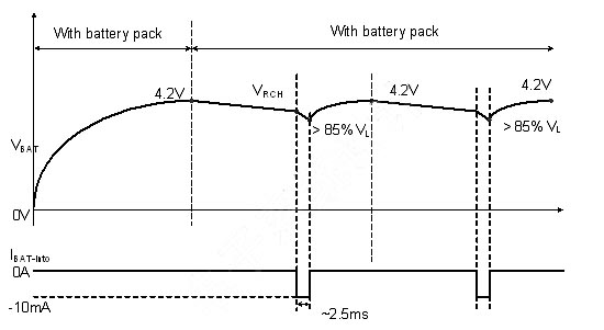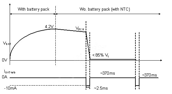 使用者亦有可能在充電或式充電完畢后,在未將電源移除的情況下,即抽離電池的情況。為避免造成危險,IC內(nèi)部應(yīng)具有如圖7, 8的電池存在偵測機制。充電IC會以短時間脈沖(每370ms產(chǎn)生2ms的脈沖)方式抽取電池電流,此時若電池存在,則偵測到的電池電壓應(yīng)大于一預(yù)設(shè)閥值;若電池已切離,則充電IC偵測到一低電壓,即可判定為電池斷開狀態(tài),并將電池端電壓切斷,保護使用者安全。